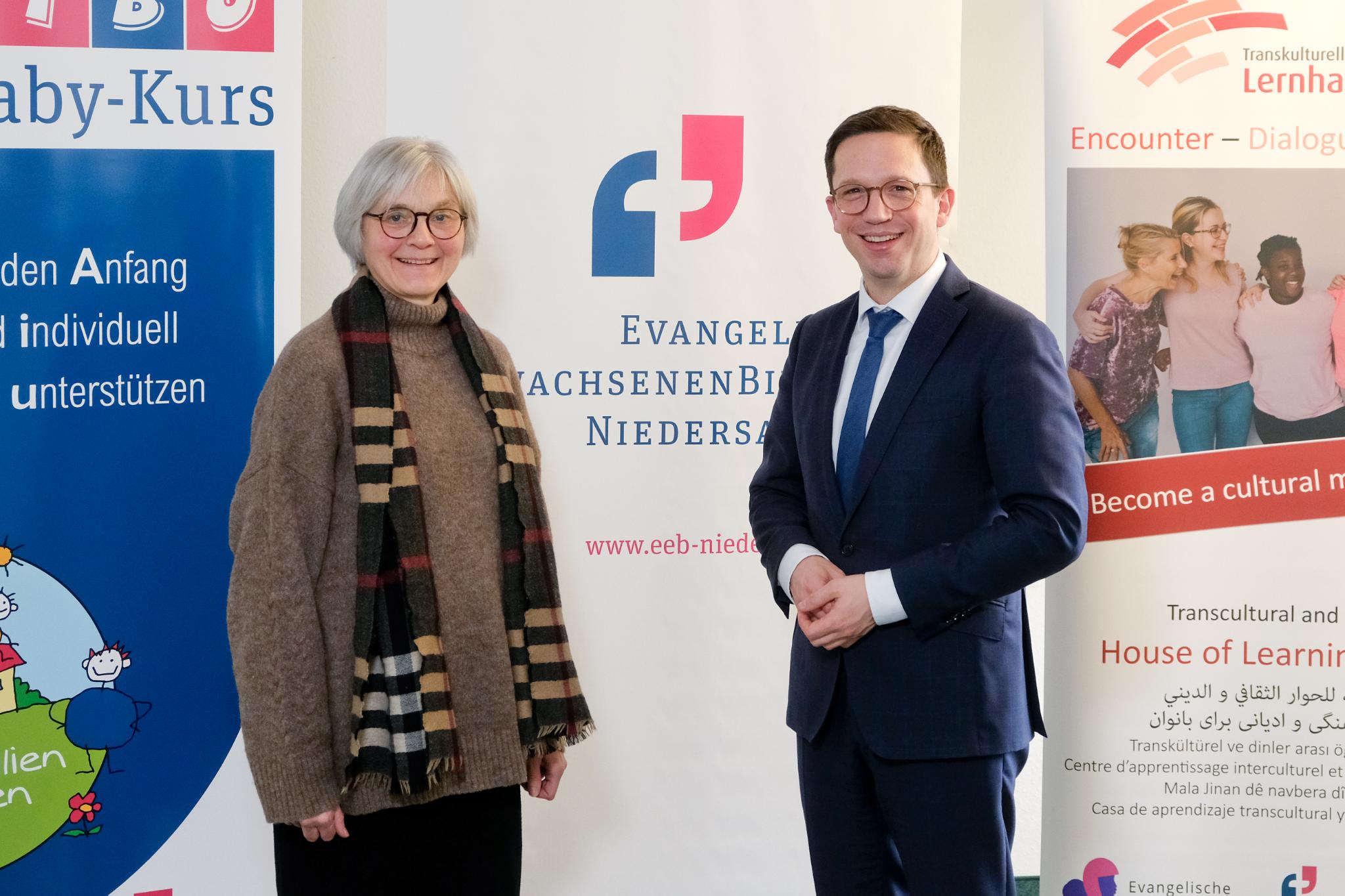 „Wir möchten Menschen in der Fähigkeit bestärken, ihr Leben selbstwirksam zu führen, es als stimmig zu empfinden und Verantwortung für sich, für andere und für die Schöpfung zu übernehmen“, sagte Ulrike Koertge, Leiterin und Geschäftsführerin der Evangelischen Erwachsenenbildung Niedersachsen (EEB). Sie freute sich über den Besuch von Mohrs und erklärte dem Minister die konfessionelle Prägung ihres Hauses. Bildung sei nicht erst seit der Reformation ein wesentliches Handlungsfeld von Kirche, sagte Koertge: „Gemäß der biblischen Tradition war es Jesus selbst, der seinen Schülerinnen und Schülern neben der Mitgliedergewinnung auch den Auftrag zur Bildung gab: Tauft sie auf den Namen Gottes und lehrt sie, was ich euch aufgetragen habe (Matthäus 28,19f).“