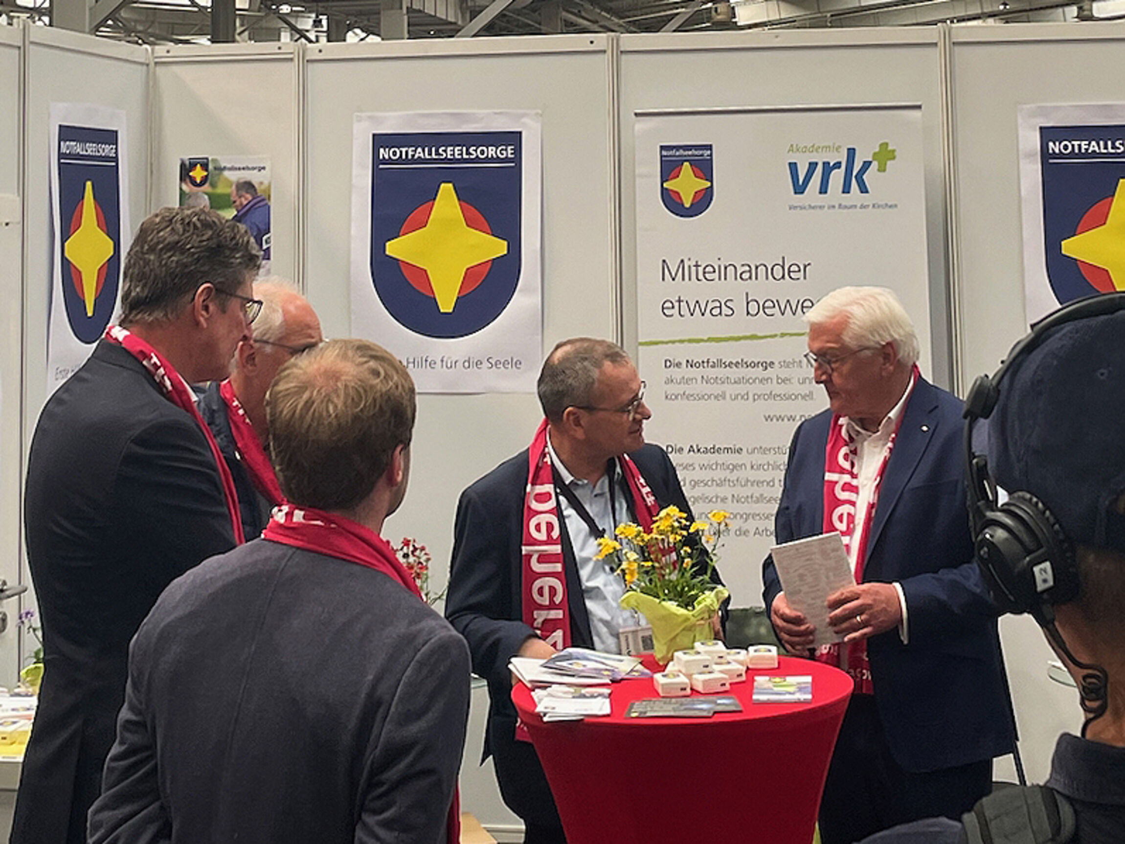 Rund 15 Minuten Zeit für die Notfallseelsorge (NFS) nahm sich Bundespräsident Frank-Walter Steinmeier bei seinem Kirchentagsbesuch. Im Gespräch mit mehreren NFS-Beauftragten und Mitarbeitenden informierte er sich insbesondere über die Ausbildungsinhalte für ehrenamtlich in der Notfallseelsorge Tätige.