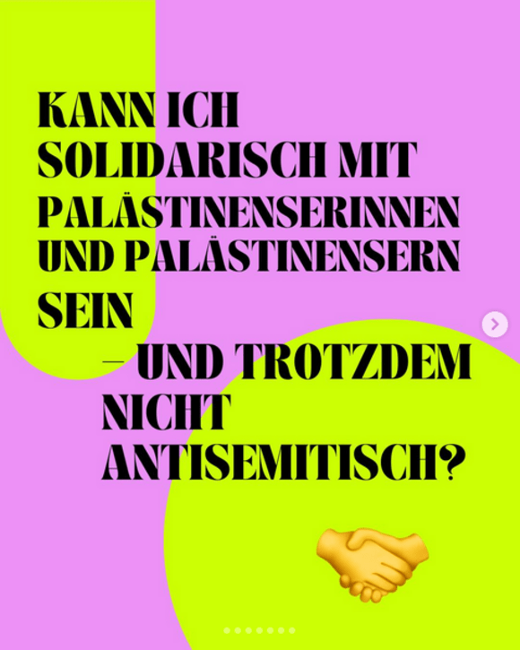 "Solidarität mit Palästinenserinnen und Palästinensern ist nicht antisemitisch. Problematisch wird es erst, wenn Empathie mit Judenhass einhergeht – etwa wenn Jüdinnen und Juden pauschal verantwortlich gemacht werden oder Israel antisemitisch attackiert wird. Politik darf und soll kritisiert werden, aber Antisemitismus ist krass menschenfeindlich. Und wer klare Haltung zeigt, schafft Raum für Mitgefühl ohne Hass."