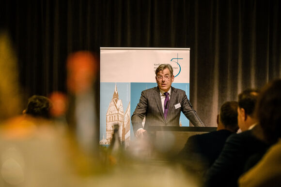 Prof. Dr. Hartmut Dorgerloh beim Vortrag "Was tun? Alte Kirchen als Baulast oder Ressource für die Zukunft? beim Parlamentarischen Abend der Konföderation evangelischer Kirchen in Niedersachsen am 7. Oktober 2025. Foto: Jens Schulze.