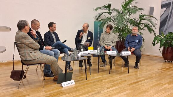 Beim Ökumenischen Forum "Klima, Schöpfung - Hoffnung?" diskutierten in Hannover: Bundesumweltministerin a.D. Dr. Barbara Hendricks (SPD), Dr. Sven Rudolph (Klimareferent der Ev. Kirche von Westfalen), MdL Jonas Pohlmann (CDU), Tobias Schäfer-Sell (Arbeitskreis Frieden, Gerechtigkeit, Bewahrung der Schöpfung), Finn-Lennart Koglin (Students for Future) und Dr. Jens Clausen (Borderstep Institut). Foto: Konföderation.