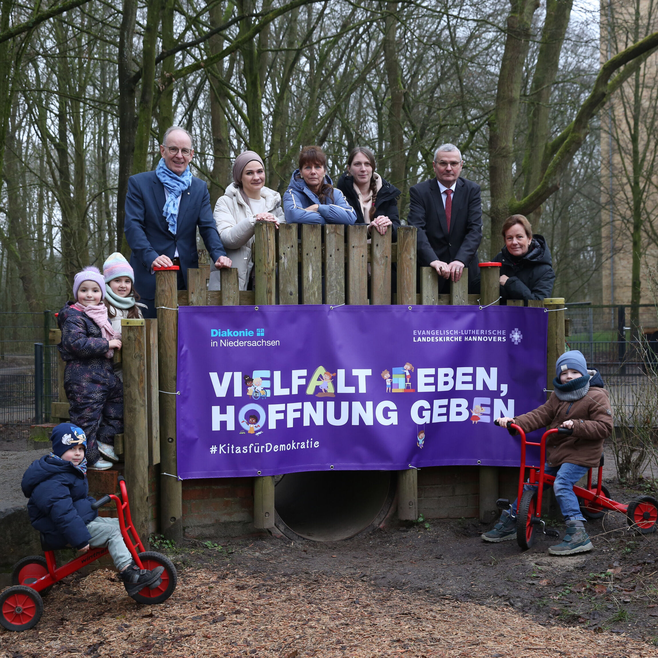 Auf der landeskirchlichen Kita-Konferenz 2024 beschlossen die 56 pädagogischen und betriebswirtschaftlichen Leitungen der Kitaverbände der Landeskirche Hannovers, sich öffentlich und klar erkennbar für Demokratie, Vielfalt und eine offene Gesellschaft zu positionieren. Daraus ist die Kampagne „Kitas für Demokratie: Vielfalt leben, Hoffnung geben.“, die sich an der Dachkampagne der Diakonie in Niedersachsen orientiert, entstanden. Das Visual wurde kindgerecht adaptiert, um so für die Kinder einen Anknüpfungspunkt zu ihrer Lebensrealität in den Kitas zu schaffen. Ab heute sind die Motive der Kampagne über Banner, Plakate sowie 18.000 Sticker landesweit an und in den Kitas sichtbar.